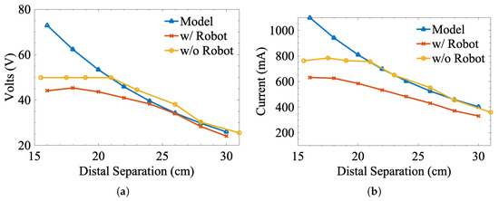 Control signal comparison. Each subfigure shows the (a) voltage and (b) current-based control signals based on predictions from the numerical model, measurements made with the robot present, and measurements made without the robot present.