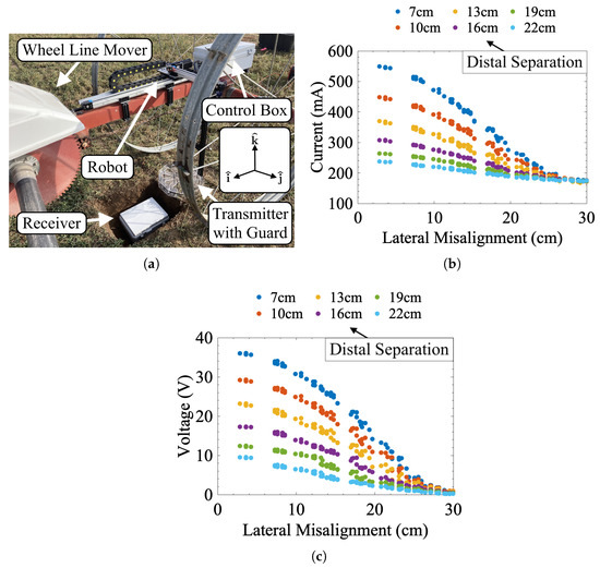 After laboratory testing, the hardware used in this work was integrated into an agricultural soil sensing platform to demonstrate the effectiveness of this misalignment perception and correction routine in real-world applications. The building blocks of this platform have been previously discussed in [33]. Fundamentally, this platform consists of a buried IPT receiver attached to multiple soil sensors. An aboveground power transmission system recharges the underground hardware and collects sensor data. Prior works faced two related issues during testing that remained largely unresolved: complete vehicle integration and misalignment correction [33]. For these field tests, the IPT system and misalignment correction hardware were mounted on a wheel line (see Figure 9a) at the Utah Agricultural Experiment Station in Kaysville, Utah. Wheel lines are pieces of agricultural equipment used in conjunction with water wells for surface irrigating crops. Operationally, a wheel line is typically moved over a planted field, and sprinklers attached to the line spray water on nearby crops. Modern wheel lines are generally moved through a field using a gas or solar-powered vehicle referred to as a wheel line mover. Most movers are only capable of 1D forward and reverse motion, though the wheels of the mover and line often form tracks in the soil that prevent lateral motion. Based on the coordinate space established in Figure 9a, the wheel line is capable of only coarse motion in the direction, while the correction hardware can move finely in the or , i.e., the same degrees of freedom as the benchtop setup. The accompanying IPT receiver box was buried under 10 cm of soil for these initial tests, though greater depths are likely possible. Once the receiver was underground, a series of sweeps similar to those in Section 2 were conducted to generate a parametric model of misalignment regarding transmitter current, receiver voltage, and lateral/distal misalignment (see Figure 9b,c for the response data). In these sweeps, the wheel line mover was parked in the general area of the underground installation. The supercapacitors and sensors were left disconnected from the receiver to reduce the number of confounding variables during alignment testing. Once parked, the aboveground alignment hardware was powered using a battery bank and driven in a grid sweep pattern to gather parametric data. These data were then aggregated and fitted into a Fourier fit model using Equation (15).