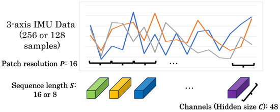 Patch embedding is a specific preprocessing step for MLP-Mixer and gMLP models, which involves dividing the input data into fixed-sized patches. In image processing, this typically means dividing an image into patch resolution . However, the patching process differs for HAR applications using one-dimensional IMU sensor data, as in this study. Here, the time-series sensor data are divided into sequential patches, each with a resolution of time steps (Figure 1). In image processing, a image divided into patches of resolution yields 196 patches (sequence length ). Each patch has a hidden size C of 768 channels , resulting in input dimensions of for the model. In the case of sensor data, with dimensions and a patch resolution of 16, the sequence length S is 16 (=, and the number of channels C per patch is 48 (=. This results in input dimensions of for the model. The dimensions of the input data for sensor-based models vary depending on the original data size. For instance, when the sensor data dimension is with a patch resolution of 16, the resulting input has a sequence length of 8 and 48 channels per patch, leading to input dimensions of . Given that the dimensionality of patched sensor data is significantly smaller than that of patched image data, we suggest that the number of MLP parameters in MLP-Mixer and gMLP models can be reduced for HAR tasks without significant performance loss.