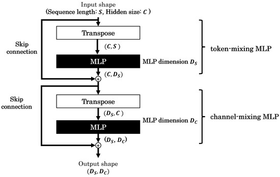 MLP-Mixer [5], proposed by Tolstikhin et al. in 2021, is an image classification model that eschews convolution and attention mechanisms, relying solely on MLPs. This model achieved comparable accuracy and inference performance to various state-of-the-art models of its time. The architecture of MLP-Mixer comprises Mixer layers, each combining two types of MLPs: token-mixing MLP and channel-mixing MLP. Figure 2 shows this structure, although, for simplicity, normalization and activation layers are omitted from the diagram. Token-mixing MLP extracts features by mixing information in the spatial direction between different tokens. Channel-mixing MLP extracts features by mixing information in the channel direction within the same token. The model is constructed by stacking multiple Mixer layers, each containing these two types of MLPs. The construction of the model requires hyperparameters: