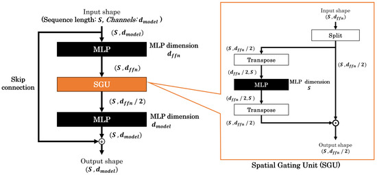 gMLP [6], proposed by Liu et al. in 2021, is an MLP-based deep learning model. It consists of gMLP blocks, which incorporate a structure called Spatial Gating Unit (SGU) alongside traditional MLPs. Figure 3 shows a gMLP block, with normalization and activation layers omitted for simplicity. The SGU, a vital component of this model, splits the input data into two parts along the channel direction and processes only one part through the MLP. This MLP extracts features from different tokens, similar to the token-mixing MLP in MLP-Mixer. The two parts are then multiplied before being passed to the next layer. A gMLP block contains two MLPs positioned around the SGU. These two MLPs perform a role similar to the channel-mixing MLP in MLP-Mixer, extracting features in the channel direction. The gMLP model is constructed by stacking multiple gMLP blocks. The construction of the model requires hyperparameters: