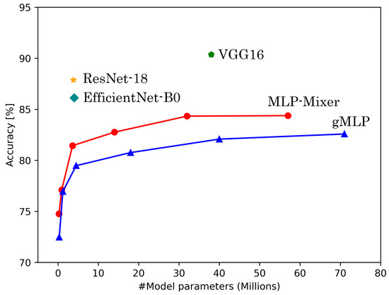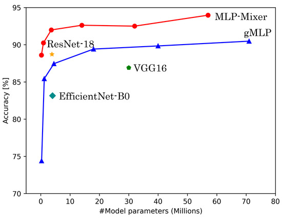 - Tolstikhin, I.O.; Houlsby, N.; Kolesnikov, A.; Beyer, L.; Zhai, X.; Unterthiner, T.; Yung, J.; Steiner, A.; Keysers, D.; Uszkoreit, J.; et al. MLP-Mixer: An all-MLP Architecture for Vision. In Proceedings of the Advances in Neural Information Processing Systems, Virtual, 6–14 December 2021; Curran Associates, Inc.: Red Hook, NY, USA, 2021; Volume 34, pp. 24261–24272. [Google Scholar]