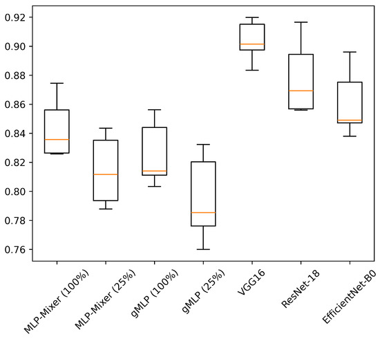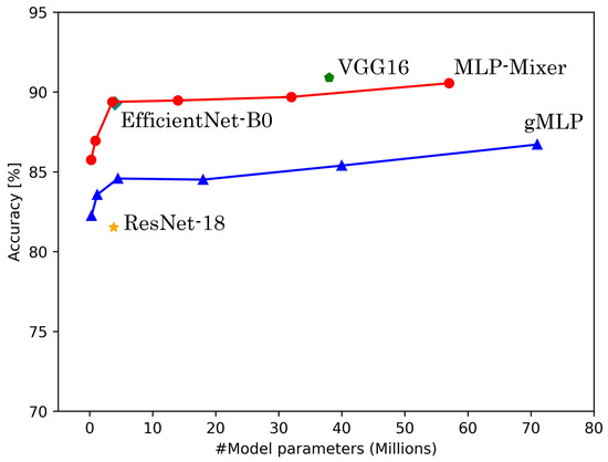 In our experiments, we evaluate the performance of both MLP-based and CNN-based models. For MLP-based models, we employ MLP-Mixer and gMLP, examining their performance across a range of parameter configurations. As for CNN-based models, we adopt VGG16, ResNet-18, and EfficientNet-B0, maintaining their original architectures as proposed in their respective papers. This selection of models allows us to compare the performance of newer MLP-based approaches against well-established CNNs in the HAR field. For MLP-Mixer, we fix several hyperparameters based on the original paper; the patch resolution is set to , and the number of Mixer layers is maintained at 12. For the three parameters that are the focus of our investigation, we use values based on those in the original paper: