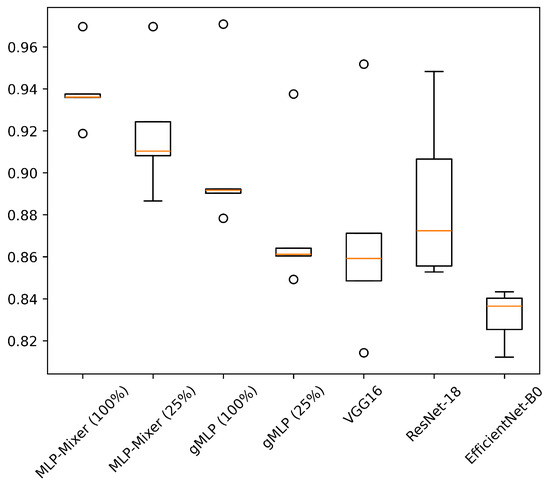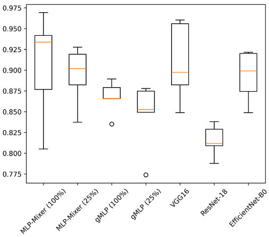 Table 6 shows the results of experiments conducted on HASC, UCI HAR, and WISDM datasets. Figure 4, Figure 5 and Figure 6 show the relationship between model parameters and accuracy. We report the accuracy and macro-F1 score as means ± standard deviations from experiments using 5 data patterns for each dataset. As we conducted five experiments for each model, Figure 7, Figure 8 and Figure 9 show the variations in accuracy. For MLP-Mixer and gMLP, we show the results for both the original parameters and the case where parameters are reduced (reduction rate = 25%) to match those of ResNet-18 and EfficientNet-B0.