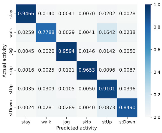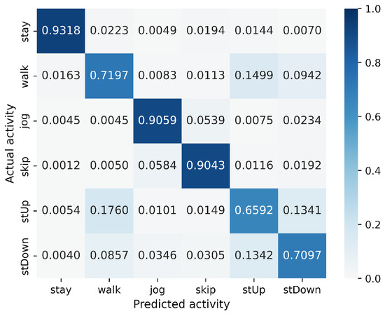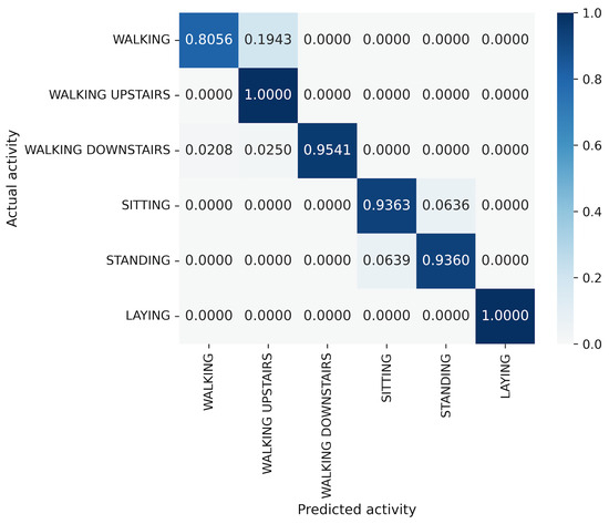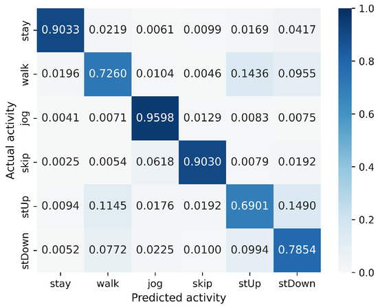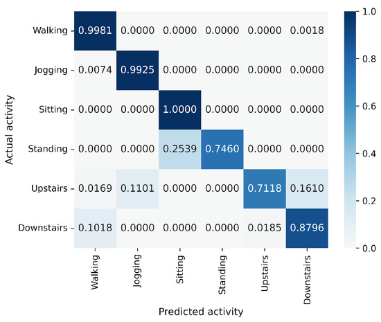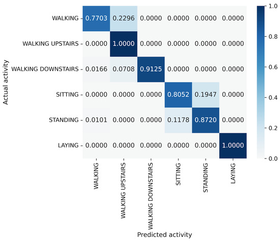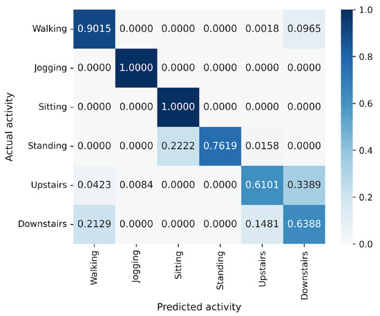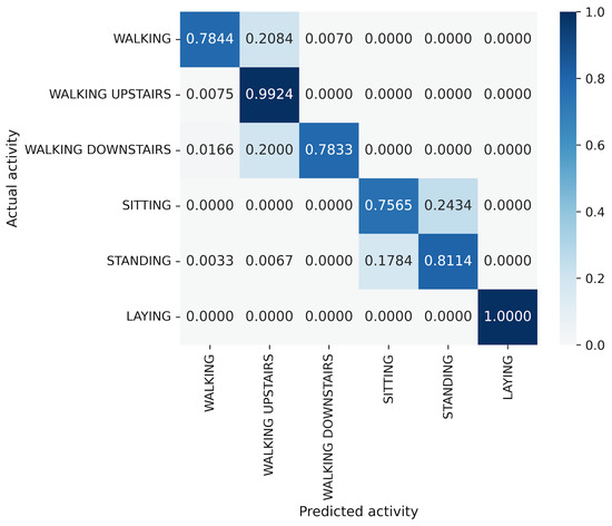 In the WISDM results, VGG16 achieves the best accuracy at 90.91%, followed closely by MLP-Mixer at 90.55%, which is slightly lower than VGG16 (Figure 6). The number of parameters for MLP-Mixer and VGG16 are 30 M and 57 M, respectively. This indicates that the performance per parameter of MLP-Mixer is lower than that of VGG16, despite MLP-Mixer having fewer parameters. Conversely, MLP-Mixer demonstrates higher performance relative to the number of model parameters compared to ResNet-18 and EfficientNet-B0. gMLP performs better than ResNet-18 but falls short of VGG-16 and EfficientNet-B0. To analyze the inferior accuracy of MLP-based models compared to VGG16, we present confusion matrices in Figure 16, Figure 17 and Figure 18 of MLP-Mixer (reduction rate = 100%), and gMLP (reduction rate = 100%) for the same data, along with the actual correct activities. High accuracy is achieved for “Walking”, “Jogging”, and “Sitting” activities across all models. In contrast, the accuracy for “Standing”, “Upstairs”, and “Downstairs” activities is comparatively lower across the models. Focusing on MLP-Mixer, we observe that it achieves accuracy rates comparable to VGG16 for “Standing” and “Downstairs” activities. However, its performance on the “Upstairs” activity is notably lower. This underperformance in recognizing the “Upstairs” activity contributes to the slightly lower overall accuracy of MLP-Mixer compared to VGG16. Focusing on the gMLP, the accuracy rates for “Upstairs” and “Downstairs” activities are approximately 10% to 20% lower than those of other models. This underperformance in these specific activities contributes to the lower overall accuracy of gMLP compared to other models.