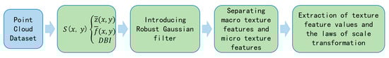 The geometric distribution values and texture feature values are calculated through the analytical model; however, during the parameter analysis of the point cloud, we can only ensure a reduction in analytical error and cannot guarantee that surface anomalies (,) generated during the collection process will not affect the results. In the boundary processing of the original scanning area, the quality of the collected point cloud dataset has a significant impact. When there are too many discrete points and edge anomalies interfering with the dataset, the separation estimation results will deviate accordingly as the distribution of interference points shifts. The defect distribution results estimated by the robust Gaussian filtering algorithm can ensure that the conditional domain of the computed results converges and maintains continuity, avoiding distortion of texture information caused by the influence of the dataset. The following introduces a robust weight function filter to enhance the accuracy and estimation efficiency of the separation algorithm in extracting macro- and micro-textures, as shown in Figure 4.