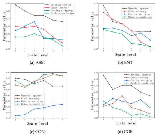 When processing multi-dimensional macro- and micro-texture image features, the results of different types of material loss methods based on Symlet discrete wavelet transform and gray level co-occurrence during texture image extraction are shown in Figure 5. This section separately presents the extraction efficiency of texture feature values and transformation scale levels in terms of ASM (angular second moment), ENT (entropy), CON (contrast), and COR (correlation). The x-axis represents the scale level, while the y-axis shows the final feature values under the corresponding scale transformation. As the scale level increases, ASM and ENT features as well as CON features exhibit local fluctuations but an overall downward trend, indicating that the texture distribution tends to become uniform and regularly computable. In contrast, contrast analysis shows an opposite trend, suggesting that the more drastic the scale transformation, the clearer the distribution of grooves in the textured surface image. This pattern aligns with the initial model design.
