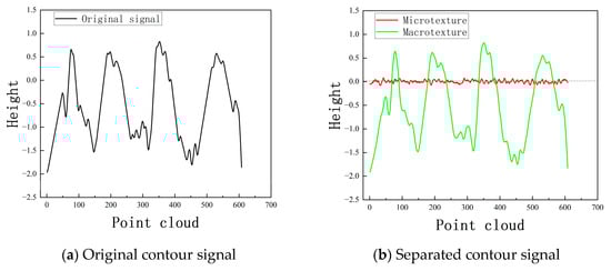 The collected original contour signal is displayed in Figure 6. From the figure, it can be seen that the macro-texture and micro-texture are mixed. If the contour signal is processed and analyzed directly, it is difficult to determine the impact of electrical performance in a certain area because it cannot be known whether that area is suppressed or enhanced, resulting in lower accuracy in the final electrical parameter estimation. Using a robust weight function to strip the original signal data Z from the scanned area, the midpoint of the two maximum value anomaly points S is selected as the center point for estimation, reducing the boundary effect on the filtering of the three-dimensional point cloud data. Figure 6a shows the selected original contour signal, and Figure 6b shows the stripped macro-morphology signal and micro-morphology signal.