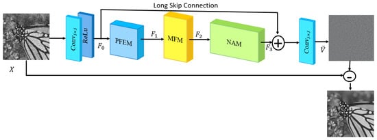 The paper designs a parallel image denoising network based on nonparametric attention and multiscale feature fusion (NAMFPDNet). The network continued the idea of DnCNN [24] by using residual learning combined with batch normalization. The denoising network structure is shown in Figure 1. The input of this network was the noisy image and the output was the residual image learned by the NAMFPDNet. The purpose of this algorithm was to learn the residual that approximated the noise , i.e., , and then remove the residual from the noisy image .