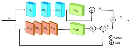 The down-branch network in this paper used four dilated convolutional residual blocks (DCRBs) in series, which were then subjected to NAM for feature enhancement. The purpose of the design of the lower branch network was to compensate for the damage to the image information structure and the loss of noise information in the first branch through different structures. The output of the down-branch network was