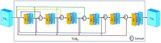 The structure of TCB is shown in Figure 3, and the input of the normalization layer in TCB came from the output of all the previous convolutional layers. This dense connection not only solved the gradient vanishing problem, but also brought powerful feature extraction capability and enhanced feature propagation. The TCB consisted of a total of five convolutional layers with a convolutional kernel size of 3 × 3, and the parameter settings of the convolutional layers are shown in Table 1. A convolutional layer of a 1 × 1 size was used to reduce the number of channels at the end of the TCB, and the number of channels of the output feature map was 64, thus effectively reducing the computation.
