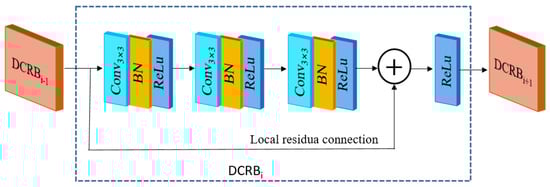 The structure of the DCRB is shown in Figure 4. The DCRB mainly consisted of a series of dilated convolutions with dilatation rates of 1, 2, and 3, respectively. The size of the convolution kernel was 3 × 3, with 64 convolution kernel numbers. The network specific parameter settings are shown in Table 2.