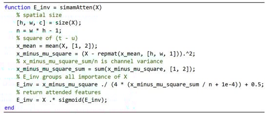 indicates the input feature map, , and indicates the number of neurons in the same channel. denotes the mean of all neurons within the same channel. represents the energy variance of the neurons within the same channel. was taken as . Lower energy meant that the neuron was more deserving of attention than other neurons. Thus, the importance of a neuron can be obtained by .