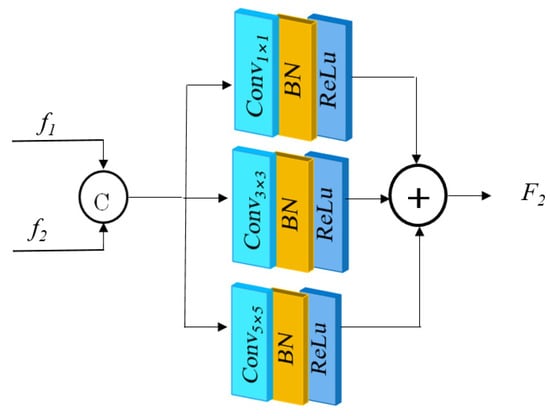 This paper uses multi-feature fusion to extract image features at different scales. The structure of the multiscale feature fusion block (MFM) is shown in Figure 6. and indicate the feature maps’ output from the upper and lower branch networks, respectively. The feature maps of the two branches were first feature-concatenated, and then feature extraction was carried out by parallel convolutional layers of convolutional kernel sizes 1 × 1, 3 × 3, and 5 × 5, respectively, with the number of convolutional kernels being 64. The extracted features were finally summed and fused. As compared to traditional single-scale convolutional operations, the multiscale feature fusion method can better recover the image contour information and texture information.