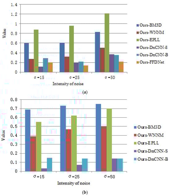 To more intuitively compare the difference between the proposed method and other methods on the Set12 and BSD68 test set, we used average PSNR. Figure 6 shows the bar chart of the difference between BM3D, WNNM, EPLL, MLP, DnCNN-S, DnCNN-B, FFDNet, and the proposed method on Set12 and BSD68. As can be seen from Figure 7, as the noise intensity increased, the difference between the proposed method and other methods also increased, indicating that the proposed method had a better denoising ability for high-intensity noise compared with other methods.