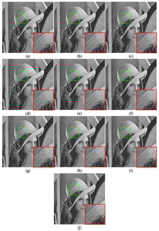 Lena image denoising results (). (a) Original image; (b) noise image/20.26 dB; (c) BM3D/32.07 dB; (d) WNNM/32.24 dB; (e) MLP/32.25 dB; (f) EPLL/31.73 dB; (g) DNCNN-S/32.44 dB; (h) DNCNN-B/32.42 dB; (i) FFDNet/32.57 dB; (j) ours/32.74 dB.