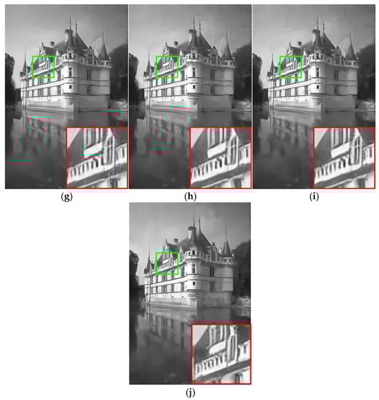 Building image denoising results (). (a) Original image; (b) noise image/14.78 dB; (c) BM3D/26.21 dB; (d) WNNM/26.51 dB; (e) EPLL/26.36 dB; (f) MLP/26.54 dB; (g) DnCNN-S/26.89 dB; (h) DnCNN-B/26.92 dB; (i) FFDNet/26.93 dB; (j) ours/26.97 dB.