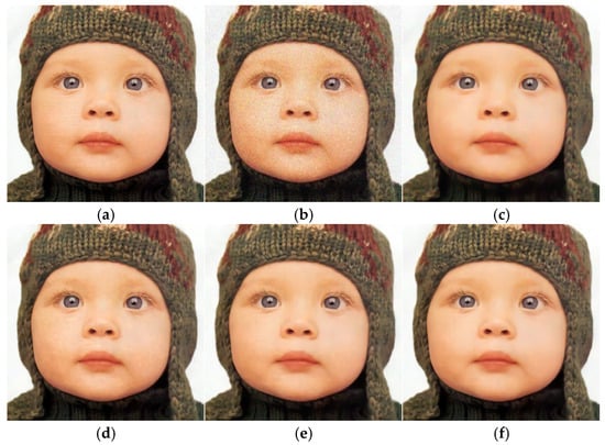 Denoising effect of different algorithms from Set5 (). (a) Original image; (b) noise image/20.8186 dB; (c) CBM3D/33.1082 dB; (d) DNCNN-C/33.1754 dB; (e) FFDNet/33.3205 dB; (f) ours/33.4017 dB.