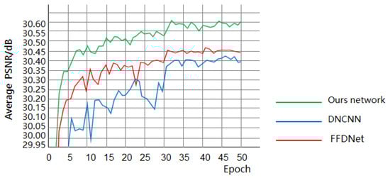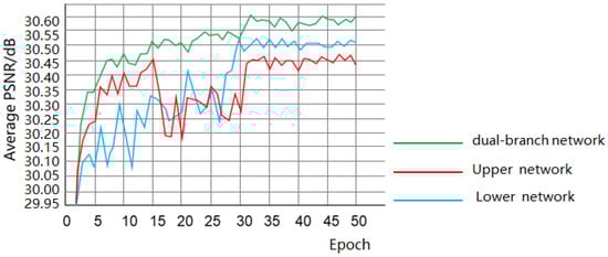 To test the effectiveness of this paper’s upper and lower branching networks for image Gaussian denoising, the upper and lower branching networks were, respectively, subjected to Gaussian image denoising on the Set12 grayscale map dataset, and the obtained average PSNR value trend (σ = 25) is shown in Figure 13. It can be seen that although the separate up-branch or down-branch networks showed well in the denoising, the denoising performance of the dual-branch network was greatly improved. It proved that the two structures can complement each other to better extract the features of the image and achieve better denoising results.