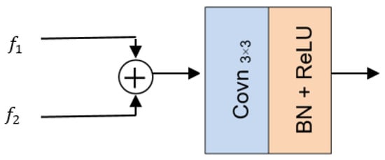 To verify the effectiveness of each module in the network, ablation experiments are conducted in this paper and Set12 was chosen for the test set. (1) The network without the nonparametric attention module (NAM) as well as the multiscale feature fusion module (MFM) was used as the baseline network (BL). (2) Adding a nonparametric attention module (NAM) to BL was called baseline with NAM (BL + NAM). (3) The channel attention mechanism was introduced in the baseline network (BL + SE) to be compared with the BL + NAM. (4) We verified the effectiveness of the multiscale feature fusion module. Two methods, the ordinary direct feature fusion method (BL + NAM + direct) and the multiscale feature fusion method (BL + NAM + MFM), were used for comparison, respectively. The ordinary direct feature fusion method is shown in Figure 15 below, and the multiscale feature fusion method is shown in Figure 6.