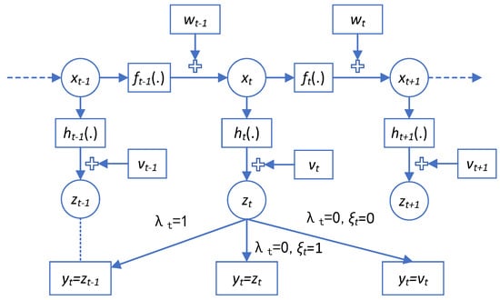 Random time delays and MMs have garnered significant research attention, resulting in numerous published studies [32,33]. Recently, the optimal filtering problem for discrete stochastic systems with finite-step autocorrelation process noise, random one-step sensor delays and MMs has been studied using the state generalization method and the principle of minimum mean square error [34]. In [35], an optimal linear filter is designed for discrete-time systems with measurement delays and MMs. In [36], a Gaussian filter is applied to address simultaneously occurring delays and MMs. However, few studies have explored the PF problem for random one-step delay and MMs. Currently, we only find that [37] uses the BPF applied to nonlinear systems with random one-step delays and MMs. However, the BPF selects the prior distribution as the importance function. Since this importance function does not incorporate observational information, it may result in particle degradation.