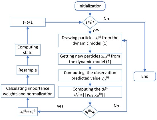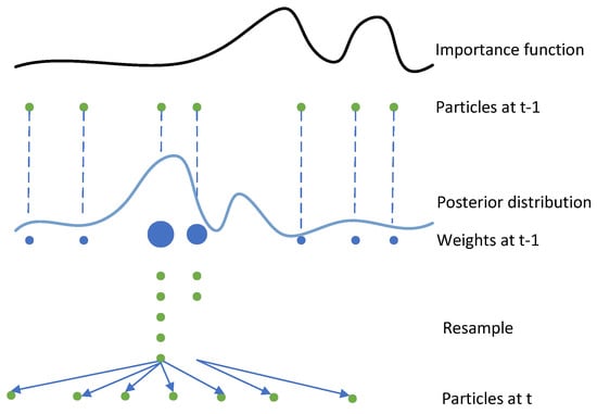 Based on the above two processes and Theorem 1, we can recursively obtain the weighted samples of from . Specifically, the PF approximates the joint posterior , which is shown in Figure 2.