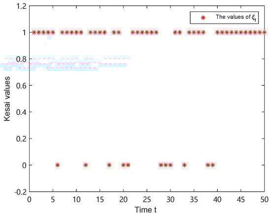 The experiment was set up for 50 time steps, and the simulation used 100 particles. The trajectories of and are shown in Figure 5 and Figure 6, respectively. It follows that the appearance of one-step delay and MMs is random.