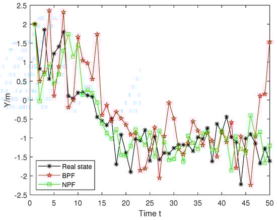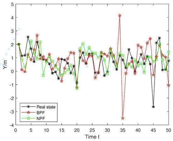 To evaluate the performance of the proposed NPF and BPF, Figure 7 compares the true trajectory of with the trajectories estimated using the BPF and NPF. The NPF demonstrates greater stability over the entire time range with estimated trajectories closely aligning with the true trajectory. In contrast, the BPF exhibits noticeable deviations from the true trajectory, particularly at time steps 33–35. These results highlight the better performance of the NPF compared to the BPF.