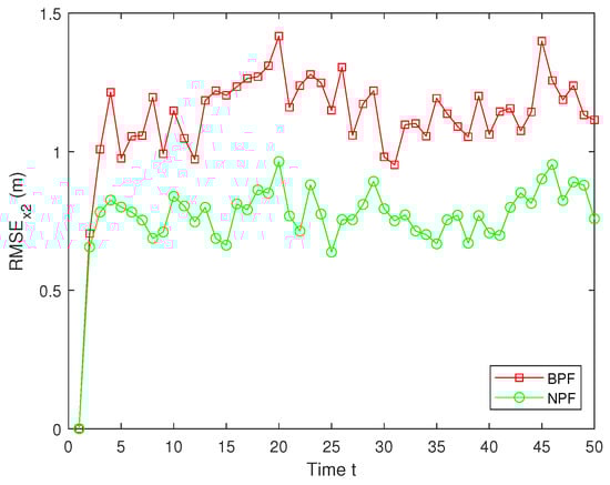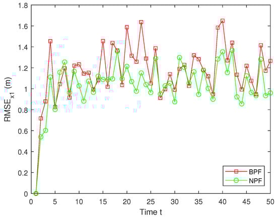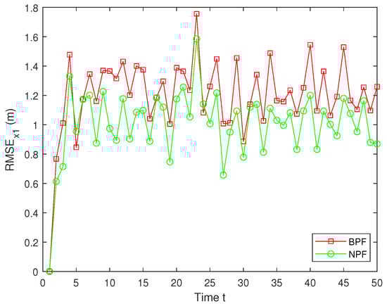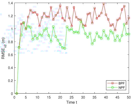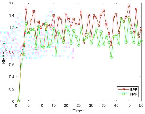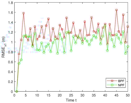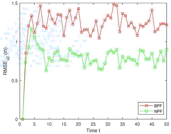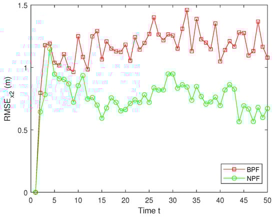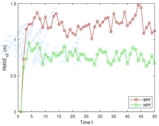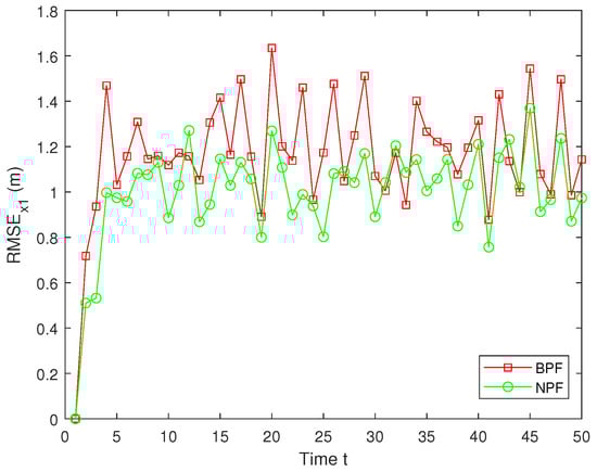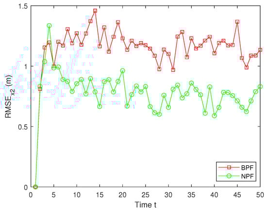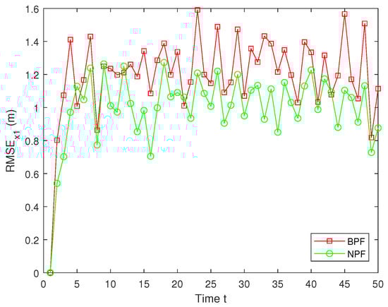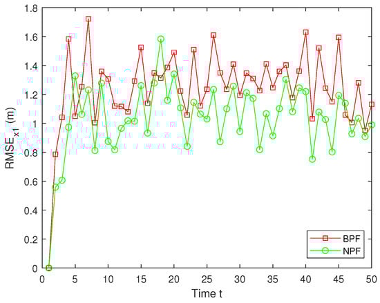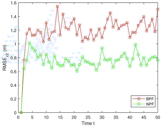 Here, represents the estimated value of . To guarantee the validity of the results, independent Monte Carlo simulations are conducted, and the simulation outcomes are derived from these experiments. The RMSE values of the estimation results for using the BPF and NPF are shown in Figure 9. The experimental results demonstrate that the NPF consistently exhibits smaller errors and higher accuracy over time. In contrast, the BPF shows larger errors at all time steps with notable error peaks occurring at several points during the simulation. These figures highlight the superior performance of the NPF compared to the BPF.