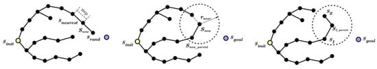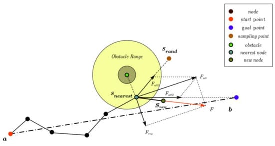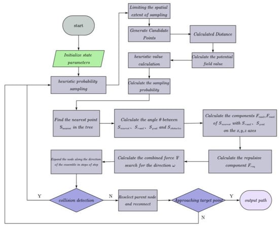 The experimental results show that the HP-APF-RRT* algorithm outperforms several key performance metrics, particularly in search time, sampling efficiency, path length, and search success rate. This improvement is primarily attributed to its heuristic sampling strategy and the incorporation of the artificial potential field method. These enhancements increase the algorithm’s sensitivity to obstacle perception and effectively direct the sampling points to circumvent obstacles. As a result, the number of required sampling points is significantly reduced, and the path optimization capability is enhanced. The HP-RRT* algorithm demonstrates improved performance; however, it is slightly less efficient than HP-APF-RRT* regarding search time and path length. The RRT, P-RRT*, and RRT* algorithms, although superior in certain aspects, fall short of the HP-APF-RRT* and HP-RRT in terms of overall performance. The RRT* algorithm, in particular, exhibits significant deficiencies in path optimization and robustness.