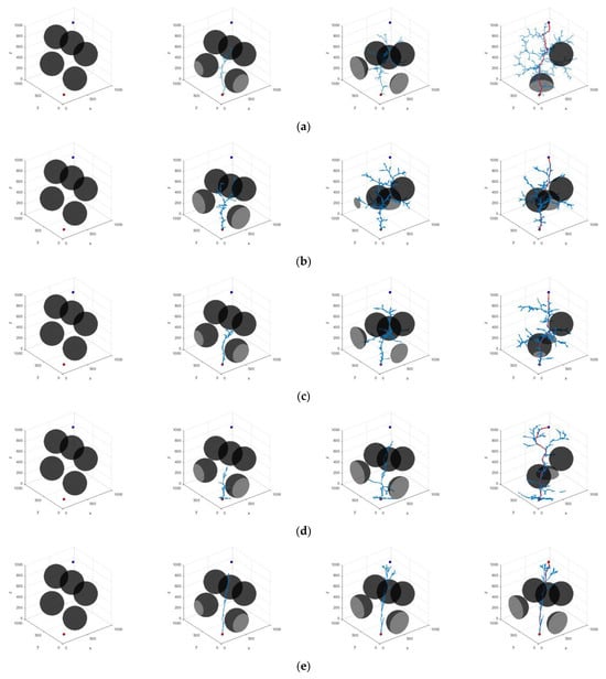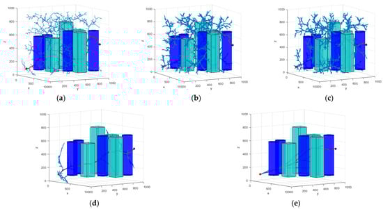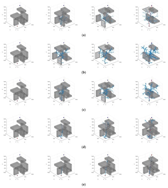 Table 5. In parts (a) to (e) of the figure, the path graphs generated by various algorithms are presented. Among them, the blue line illustrates the exploration tree structure of the algorithm, and the red solid line denotes the path planned by the corresponding algorithm. In order to reflect the boundary extension property of the algorithm, no additional safety distances were incorporated into the actual collision judgment. As a result, the path lines appear to be very close to the surface of the obstacle.