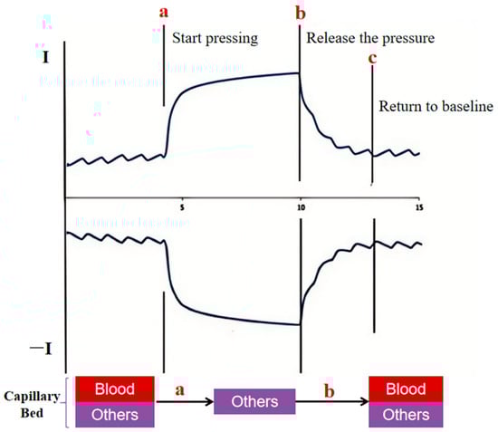 According to the Lambert–Beer law [], when the ventral surface of the distal phalanx of the right index finger is vertically irradiated using continuous parallel single-wavelength NIR light, the amount of absorbed light is directly proportional to the thickness of the irradiated tissue and the concentration of hemoglobin (oxyhemoglobin + reduced hemoglobin). As shown in Equation (1), when the amount of incident light, I0, is constant, the tissue thickness, B, is constant, and the molar absorption coefficients of hemoglobin for 900 nm near-infrared light, KHbO2 and KHb, are constant, then the amount of transmitted light received, I, can reflect the change in the concentration of hemoglobin (oxygenated hemoglobin + reduced hemoglobin) in the blood flow, CHbO2 and CHb. When the blood flow at the end of the finger changes, the CHbO2 and CHb in the capillary bed will also change, and the transmitted light quantity, I, will also change in synchrony with the blood flow at the end of the finger.