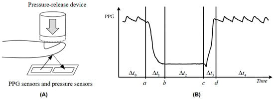(A) Electromagnet-based press-release device capable of instant rebound after power failure that does not interfere with blood return like other mechanical compression devices. PPG sensors are able to continuously monitor the amount of light reflected from the end of the finger, and pressure sensors monitor the amount of pressure in real time. (B) PPG signal curve. The regular undulation with the heartbeat is called the baseline state. When the instrument automatically detects the baseline state for a period of time, the pressing device starts to apply pressure to the finger, and this period of time is recorded as ∆t0; with the gradual increase in the pressure, the arterial blood in the capillary bed is gradually drained, and the concentration of hemoglobin drops sharply, which is reflected in the figure as a section of the PPG signal curve that decreases rapidly. The PPG signal curve decreases rapidly when a certain pressure threshold value (3–5 N) is reached, the pressure device stops increasing the pressure, and this period of time is recorded as ∆t1. Since the end of the finger is essentially emptied of blood, it is reflected in the figure as a segment of the PPG signal curve that is essentially free of fluctuations, and the period of time during which the signal remains steady at a low level is denoted as ∆t2. The electromagnet is released instantaneously, the blood in the capillaries at the end of the finger gradually fills up, and the blood circulation and hemoglobin concentration will return to pre-pressure levels for a period of time, denoted as ∆t3. After the PPG signal curve returns to a stable fluctuation, it then continues to be observed for a period of time as a sign of a successful test, which is denoted as ∆t4. a: initiation of compression; b: maintenance of compression; c: release of pressure; d: return of blood to return to baseline status.