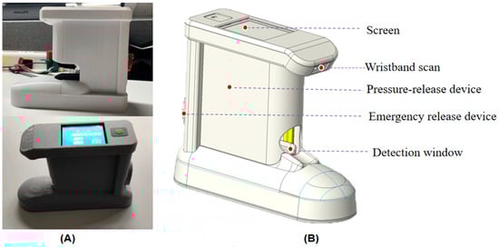 The capillary refill time measuring instrument is mainly composed of a PPG sensor module, a pressure sensor, a power actuator module, a lithium battery pack, a microcontroller and its control circuit, an emergency release device, a scanning port for the wristband, and a high-definition display (Figure 4). Compared with the existing measuring instruments, this instrument has the following advantages: a compact size that is easy to use in emergency departments and outpatient wards; a unique electromagnetic design allowing the pressure device to instantly rebound and ensuring that the measurement results are true and reliable; the addition of a wristband scanning port, which enables scanning the patient’s wristband to automatically import the information of the test subject and storage of the test results and is easy to use in the clinic; a uniquely designed emergency release device allowing the pressure to be released and the measurement to be stopped at any time, which ensures the reliability and reliability of the measurement results and ensures the safety of the instrument; a visualization window design allowing the measurer and the subject to intuitively see the finger placement position and perform timely adjustments to improve the success rate of the measurement; and an ergonomic design to fit the hand shape so that the hand is relaxed and comfortable to avoid measurement errors caused by the stiffness of the hand.