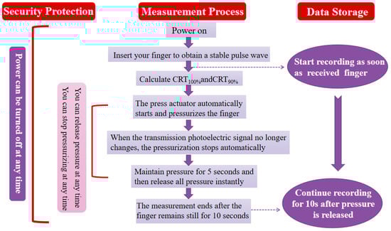 We set up the measurement control logic for the instrumentation of capillary refill time based on the clinical application scenario and set the pressure of the machine on the finger to be automatically controlled by the software, stopping the pressure when the detected waveform of the electrical signal is a straight line and releasing the pressure automatically after it has been maintained for 5 s, which is equivalent to the pressing time of the finger using a final pressure of 5 s. It is important to note that a stable pulse waveform needs to be obtained before the start of the measurement to determine the baseline position. Data recording began with the recording of a stable pulse wave pattern 5 s before compression and continued until 10 s after the end of compression to ensure that the recorded blood flow refill curve returned to the baseline position. In addition, considering the safety of clinical use, protection control is set up so that the power supply can be cut off at any time during the whole measurement process, compression can be stopped at any time during compression through the ‘emergency release device’, and compression pressure can be released at any time, according to the clinical use scenarios set up in the control logic diagram shown in Figure 5.