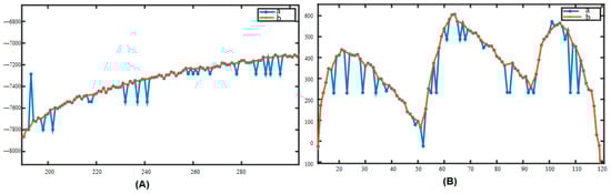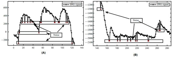 Schematic diagram of mutation noise. In addition to the photoelectric volume pulse wave signal, the noise collected during signal acquisition is influenced by multiple factors including sensor sensitivity, contact tightness, skin hydration level, and epidermal thickness at the measurement site. (A,B) are noise diagrams. This type of noise manifests randomly without a fixed frequency. Upon occurrence, it completely obscures the original signal and cannot be eliminated through conventional filtering techniques. Furthermore, this noise significantly interferes with signal processing, leading to failures in algorithms designed for peak and valley point detection, ultimately resulting in measurement inaccuracies.
