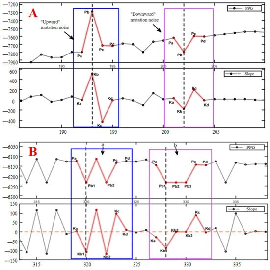 In the process of analyzing and processing the blood oxygen measurement data, we found that under the influence of the photoelectric sensor, there is often a sudden change in the data (as shown in Figure 6), which appears randomly and has no fixed frequency; when it appears, it completely masks the original signal value, which belongs to the other noises in the fourth type mentioned above, and it is impossible to remove it by using traditional filtering methods. At the same time, this type of noise can cause serious interference to the signal calculation results, such as causing the peaks and valleys detection algorithm to fail, which, in turn, leads to measurement failure. Define Pa, Pb, Pc, and Pd to denote the four stages of the mutation noise, the beginning of the mutation, the mutation recovery, and the end of the mutation, respectively, as well as the corresponding instantaneous slopes of the four points as Ka, Kb, Kc, and Kd, respectively. Among these, if downward mutation noise occurs, the corresponding instantaneous slopes of the signals will, in general, reflect the characteristic of ‘down (Ka-Kb)-up (Kb-Kc)-down (Kc-Kd)’ in the lower right part of Figure 7A; if upward mutation noise occurs, the corresponding instantaneous slopes will reflect the characteristic of ‘up-down-up (Kc-Kd)’ in the lower left part of Figure 7A; and if upward mutation noise occurs, the corresponding instantaneous slopes will reflect the characteristic of ‘up-down-down-up (Kc-Kd)’ in the lower left part of Figure 7A. When a continuous mutation in time and long-duration mutation occurs, more than one mutation point will appear, at which time the mutation point Pb becomes a collection with (Pb1, Pb2, and Pb3) and so on appearing in it.