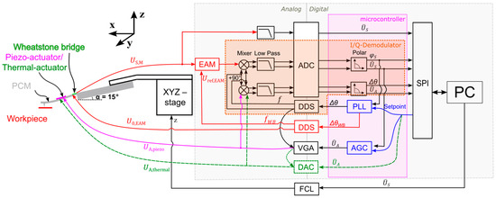 with an additional gain. Here, and denote the amplitude and frequency of the EAM. The phases , and the amplitudes , of sensor and actuation signal, respectively, are measured by the I/Q demodulator. The parameters and can be kept constant at set points by adjusting and with the help of a PLL (Phase-Locked-Loop) and an AGC (Automatic Gain Control), respectively. In this way, the contact resonance frequency can be tracked. The DC component of the sensor signal, representing the contact force, is kept constant by adjusting the z-position of the PCM by an FCL (Force Control Loop), achieving a topography tracking of the sample. For further details, see [34].