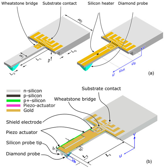 Schematic of electrothermal-actuated (a) and piezoelectric-actuated (b) piezoresistive microprobe (ETA-PCM and PEA-PCM).