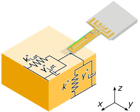 When a PCM oscillates with its tip in contact with the surface of a sample, additional forces act on the beam related to vertical and lateral contact stiffnesses and , as shown in Figure 3. Assuming that the vibration amplitude at the probe tip is significantly smaller than the static deformation of the sample and probe tip, and are almost constant. This results in a linear system of equations, which is evaluated using the transfer matrix method [49,55,56]. At too large oscillation amplitudes, nonlinear behavior is observed [57] which can be taken into account [58,59,60]. Since time-dependent behavior, in addition to static deflection, shall be analyzed, the viscosity of the contact materials is also considered (see Appendix D).