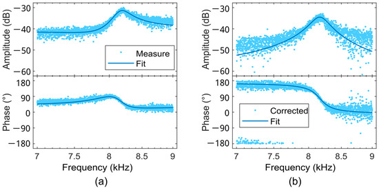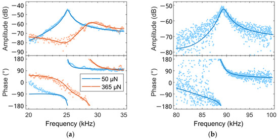 Figure 4a shows a measured PCM vibration spectrum around resonance, revealing asymmetric line shapes of amplitude and phase, which is modeled by fitting using Equation (22). After subtracting the parasitic component , the line shapes of the amplitude and phase of a single harmonic oscillator are obtained (Figure 4b).