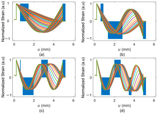 Strain along the surface of the cantilever in the eigenforms of the (a) first, (b) second, (c) third, and (d) fourth vertical bending mode, calculated for a diamond-tip sensor with contact stiffness between 0 and 100 kNm−1 and contact damping between 0 and 1 mNsm−1. The blue bars indicate the optimum positions and polarities of the actuators.