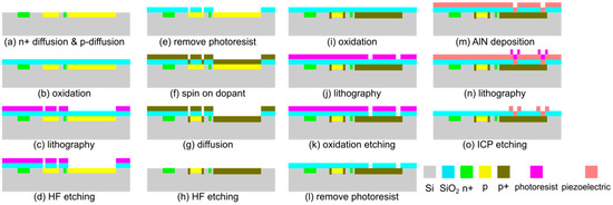 The piezoresistive Wheatstone bridge of the PCM converts mechanical strain into electrical signals, whose resistors are built by p-diffusion and p+-diffusion (for contact formation). The doping parameters for it have to be adopted to the boundary conditions by the manufacturing process. Meanwhile, the wires and bottom electrodes of PEAs are simultaneously built by the p+-diffusion step, while the substrate contact is realized by n+-diffusion. In this study, we use diffusion from a spin-on-deposited (SOD dopant source, which does not require dangerous gases, including related safety precautions, and is more environmentally friendly. Similarly to ion implantation, it allows area-selective doping, e.g., of shallow resistors and piezoresistors using lithographic patterning. Meanwhile, it is also the simplest, most widely available technique adaptable to different platforms, as indicated by its long history. During diffusion, there is minimal lattice damage, although excess dopants tend to aggregate at the surface. Nevertheless, unless a drive-in phase is incorporated into the manufacturing process, diffusion typically (but not always) results in lower cross-wafer uniformity than ion implantation, and the dopant concentration is fixed at the solid solubility concentration [43]. Correspondingly, sheet resistance and dopant depth profiles in resistive layers depend on diffusion temperature and time, which must be determined beforehand using monitor wafers.