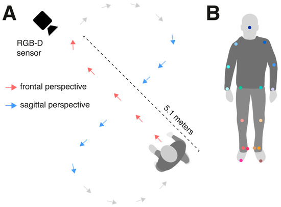 The evaluated vGait method utilized an RGB-D sensor (Azure Kinect, Microsoft, Redmond, WA, USA) mounted on a tripod at a height of 1.4 m (see Figure 1A). Raw data (including RGB images at a resolution of 3840 × 2160 pixels and depth images at a resolution of 640 × 576 pixels with a depth field of view (FOV) of 75° × 65°) were captured at a fixed sampling rate of 30 Hz using the Kinect Azure Sensor SDK. The sensor was positioned such that participants walked along a straight path toward the sensor (frontal perspective) and along a straight path laterally across the camera’s view (sagittal perspective).
