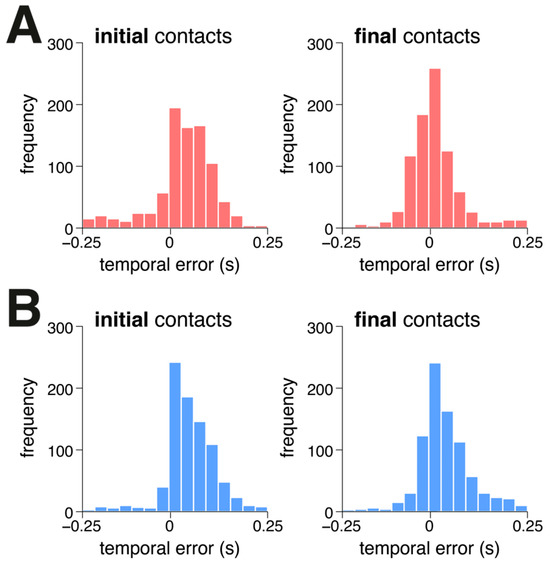 Histograms illustrating the temporal agreement (tgold standard–tvGait) of initial and final foot contacts identified by vGait compared to the gold standard during (A) frontal-perspective walking and (B) sagittal-perspective walking.