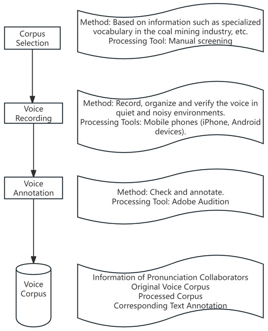Currently, there is a significant lack of openly accessible corpora concerning the dialect used within the coal mining sector in Northern Shaanxi. To facilitate research in the realm of speech recognition for the North Shaanxi dialect, this study has successfully compiled a specialized dialect corpus for the Northern Shaanxi coal mining industry. The methodology employed in constructing this corpus is detailed in Figure 1.