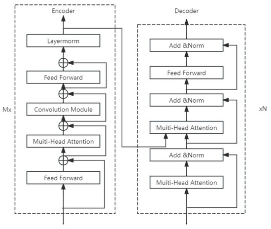 The advantage of the Conformer architecture as an encoder lies in its ability to process both time-domain and frequency-domain features of the audio signal. This dual processing capability allows the Conformer to yield a rich audio representation, enhancing its understanding of the input audio signal and providing more informative features for the subsequent decoder stage. Nevertheless, the Conformer structure exhibits limited text generation capabilities within its decoder. To address this, the present study employs a Transformer-based decoder. The self-attention mechanism inherent in the Transformer is adept at managing long-range dependencies, which allows the decoder to take into account the global context when generating text. This results in the production of accurate and coherent textual outputs. The proposed architecture is depicted in Figure 4.