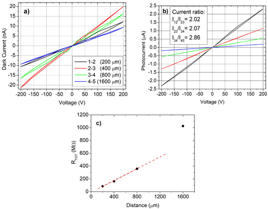 I–V curves for pairs of adjacent contacts: (a) without illumination (dark current); (b) under illumination at 254 nm (50 μW/cm2); (c) the total resistance under illumination as a function of the distance between electrodes; the TLM analysis [39] has been applied only to the initial linear trend (red dashed line).