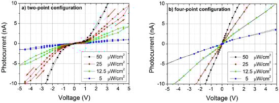 The same range of current was investigated in the four-point probe configuration for the same pair of contacts, labeled 3 and 4 (Figure 4b). In this case, the I–V characteristics exhibit good linearity and no hysteresis effects in the loop were observed at any photon flux level. This result was attributed to the decoupling of voltage–current circuits, as described in the Section 2.