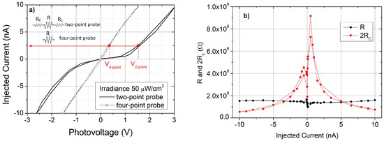 For an injected current below 4 nA (low-current region), the photovoltage shows very little variation for both configurations; in the mid-current region (from 4 nA up to 1 µA), the four-point probe curve is nearly ohmic, while the two-point probe curve shows a drastic change in slope with a flex at about 10 nA as a consequence of the abrupt decrease of RC for increasing current, already shown in Figure 5b. Finally, in the high-current region above 1 µA, the curves run parallelly for both measurement configurations, with a slope that approaches unity as expected for an ohmic regime of conduction.